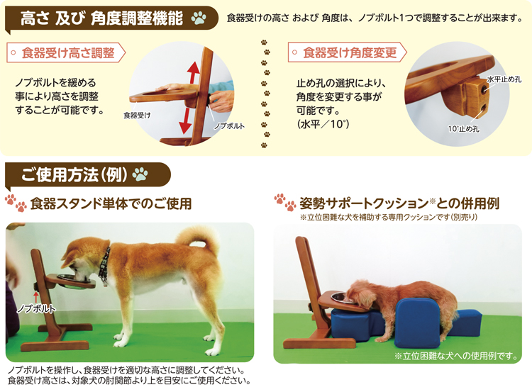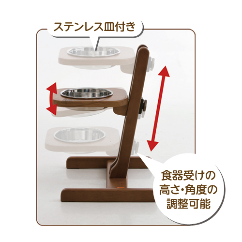 子犬からシニア犬まで成長にあわせて高さを調整でき、適切な食事姿勢を促すことにより誤嚥を防止します。高級感のある木製の台と衛生的な国産ステンレス皿のセット。