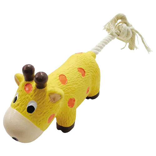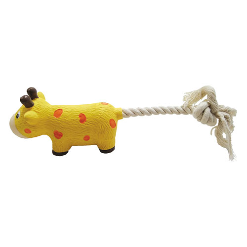 スクィーカー入りのラテックストイのお尻にコットンロープ付き。引っ張りっこや持ってこい遊びにも◎