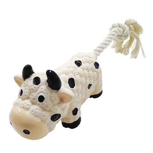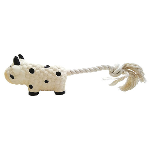 スクィーカー入りのラテックストイのお尻にコットンロープ付き。引っ張りっこや持ってこい遊びにも◎