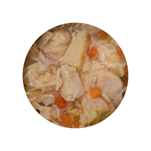 低カロリーな鶏ささみの厚切りを丸鶏スープでじっくり煮込みました。高い嗜好性のウェットフード(一般食)です。