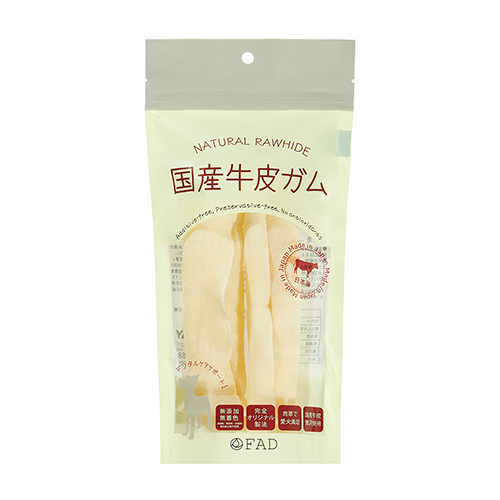 国内で食用に飼育された牛皮を贅沢に使用し、国内工場で管理・加工された完全国産牛皮ガム。