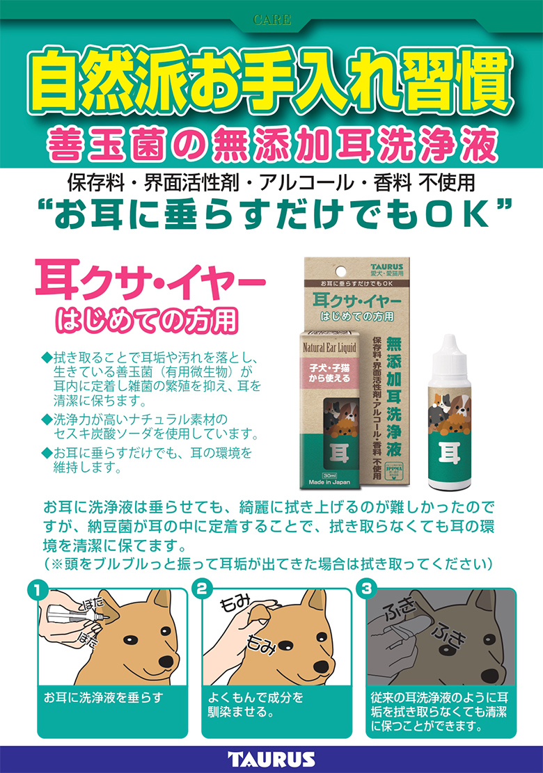 拭き取る事で耳垢や汚れを落とし、生きている善玉菌(有用微生物)が耳内に定着し雑菌の繁殖を抑え、耳を清潔に保ちます。