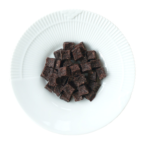 食肉用に捕獲した、エゾ鹿の腕・スネ・ネックの肉を使用。筋や脂を丁寧に取り除き、ミンチした後手捏し与えやすい一口サイズにカット。独自の乾燥方法でサクサクとした食感に仕上げています。