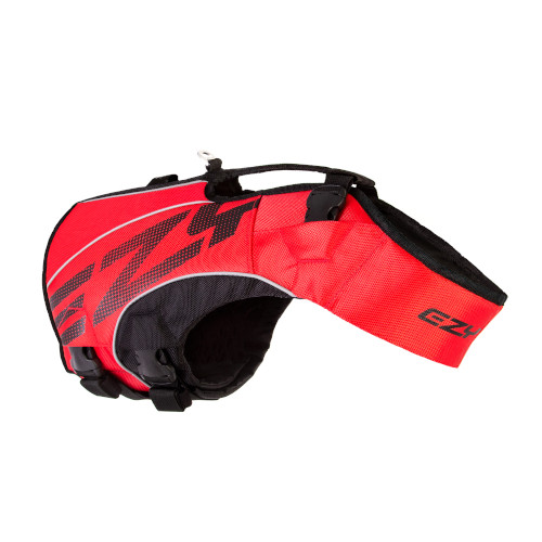 立体的なデザインで体にフィットし、可動域が広く泳ぎやすい。軽くて丈夫な犬用フローティングジャケット。