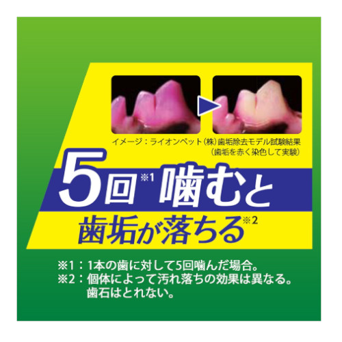 当社独自のブラッシング繊維のギザギザねじり形状のガムを噛むことで、歯面の歯垢をかき出す。