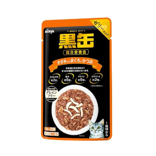 DHA、EPA、鉄分、タウリン、ビタミンEを含むまぐろとかつおの赤身肉ベースの総合栄養食。穀物が苦手な猫にも適したグレインフリー設計。善玉菌を増やし腸内の健康をサポートするオリゴ糖を配合。ゼリータイプ。
