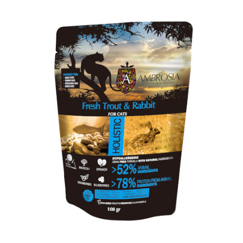 ●トラウト(30%)、ドライラビット(21%)、ドライポテトフレーク、エンドウ豆、割ったエンドウ豆、ポテトタンパク、ビートパルプ、リグノセルロース、ビール酵母、加水分解酵母、サーモンオイル(1%)、ドライチコリ(FOSとイヌリンの供給源として)、ドライアップル、ドライ人参、DL?メチオニン、塩化コリン、タウリン、ドライブロッコリー、ドライほうれん草、ドライトマト、ドライクランベリー、ドライブルーベリー、ビタミンE(一部保存料として)、L ?カルニチン、塩酸グルコサミン(100mg/kg)、コンドロイチン硫酸塩(100mg/kg)、亜鉛、ドライハーブ(ユッカシジゲラ、ローズマリー、ウコン、シトラス、ユーゲニア)、ビタミンB12、ビオチン、ナイアシン、パントテン酸、マンガン、ビタミンA、ビタミンB2、銅、ビタミンB1、ビタミン B6、ヨウ素、葉酸、セレン、ビタミンD3