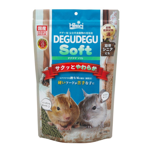 一般的なペレットのおよそ1/2の硬さ、姉妹品ひかりデグデグの1/4の硬さと、やわらか仕上げになっているため、硬いフードが苦手な子に最適です。特に、ペレットを食べ始めの幼体や4歳を過ぎた高齢のデグーにおすすめです。