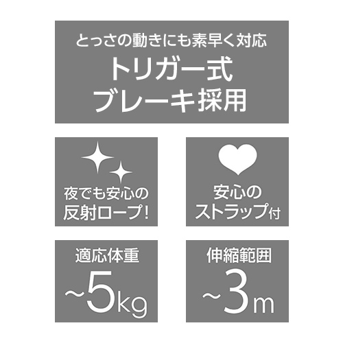 ●とっさの動きにも素早く対応出来るトリガー式ブレーキ、安心のストラップ付、夜でも安心の反射ロープ。