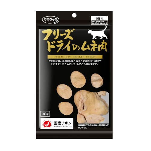 ●鶏ムネ肉は高タンパク、低脂質。ササミよりも脂質の香りが強く、食欲をそそります。飽きないようにササミと交互に与えるのがおすすめです。素材のままの味、香り、栄養を損なわないのは弊社独自のフリーズドライの特徴です。原材料調達から加工・包装まで、全て国内で行っておりますので安心してご利用ください。