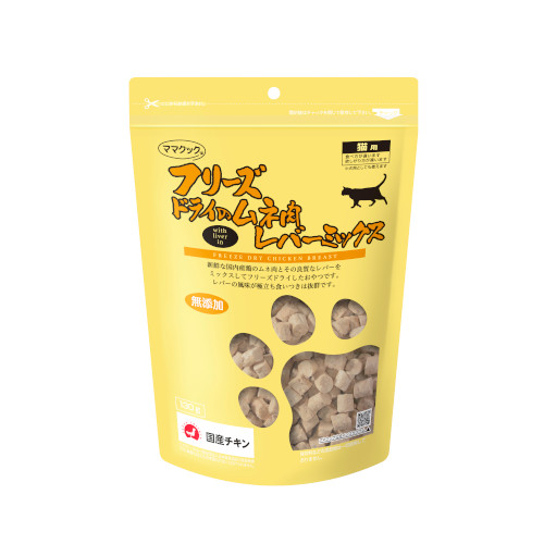 ●嗜好性が高く、そのまま与えられるフリーズドライのおやつです。成型の為のツナギなどは使用せず、新鮮な鶏ムネ肉と鶏レバーのみの完全無添加で仕上げています。潰してトッピングとしてもご使用いただけます。素材のままの味、香り、栄養を損なわないのは弊社独自のフリーズドライの特徴です。原材料調達から加工・包装まで、全て国内で行っておりますので安心してご利用ください。