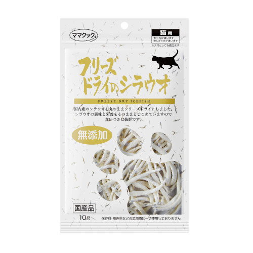 ●シラウオは日本食では高級魚として扱われています。国内産の生食できるシラウオを原料にしフリーズドライにしているから生の風味と栄養が猫ちゃんの食欲をそそります。素材のままの味、香り、栄養を損なわないのは弊社独自のフリーズドライの特徴です。原材料調達から加工・包装まで、全て国内で行っておりますので安心してご利用ください。