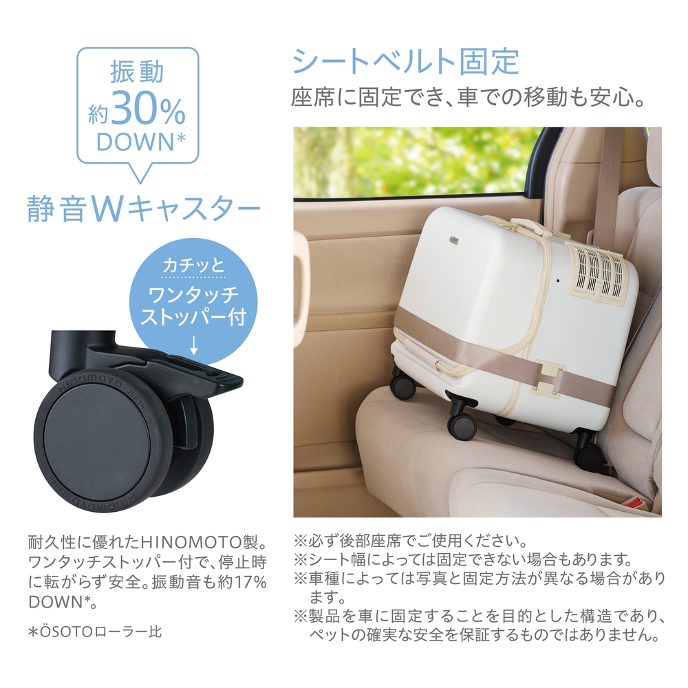 シートベルトで座席に固定できるベルトガイド付きなので、車での移動にも。