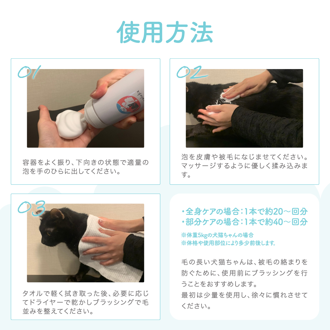 他にもお散歩後の手足や排便後のお尻周りなどの部分用や皮膚がデリケートな犬猫ちゃんやお水を怖がる犬猫ちゃんにもお使いいただけます。