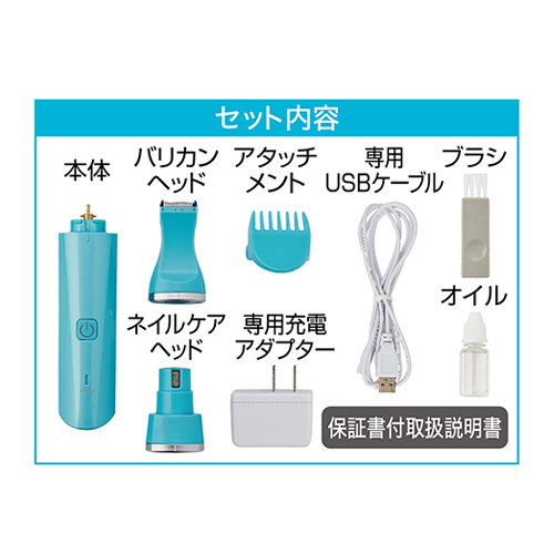 ●USB充電式(アダプター・ケーブル付属)。コードレスでどこでも使える。充電しながら使える、専用アダプター・モバイルバッテリーで充電可能。※1000mA出力のものをご使用ください。フル充電でバリカンは約60分間・ネイルケアは約45分間使用可能。(連絡使用時間15分)