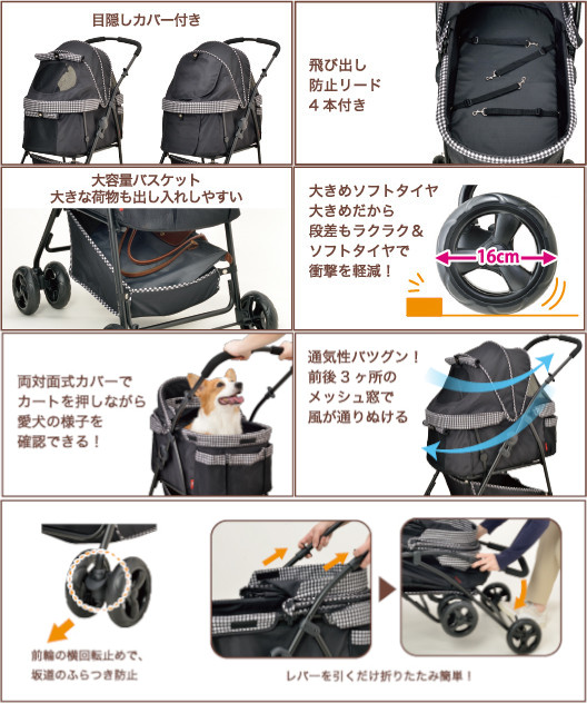 ●バスケットには4頭まで対応できる飛び出し防止リード4本付き。