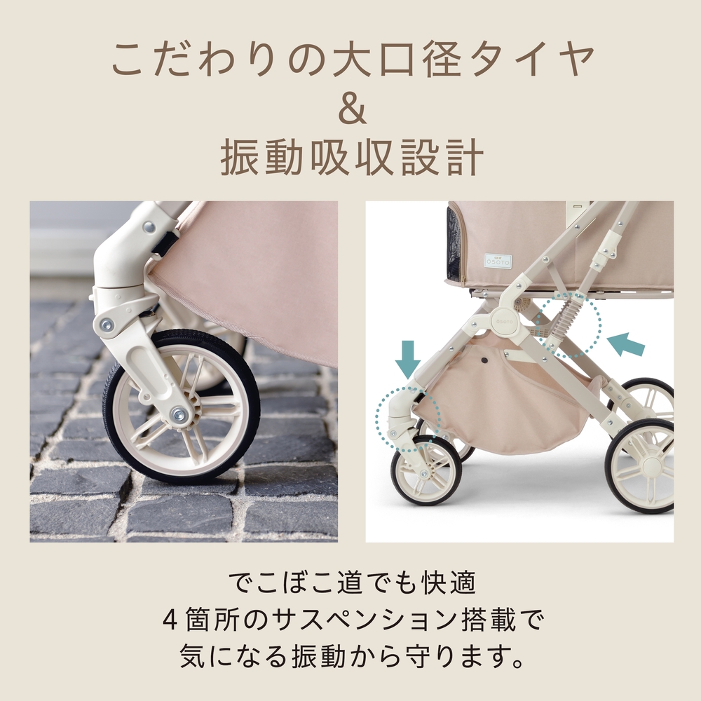 前輪とフレームの計4ヶ所にサスペンションを搭載。気になる振動からペットをやさしく守ります。