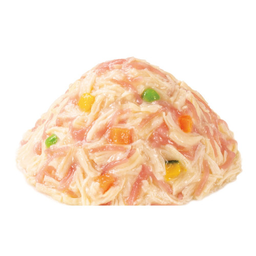 ●原材料:こんにゃく、鶏肉(ささみ)、野菜類(人参、かぼちゃ、グリンピース)、チキンエキスパウダー、寒天、酵母エキス、タンパク加水分解物、増粘安定剤(加工でん粉、増粘多糖類)、ビタミンE、緑茶エキス、紅麹色素