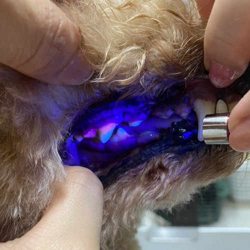 ・歯垢・歯石の沈着が重度の場合は、強い赤、赤紫、橙色に蛍光する傾向があります。