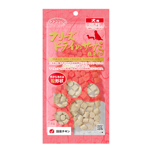 ●ママクック1番人気のフリーズドライのササミを与えやすい粒タイプにして仕上げました。国産鶏ササミの味、香り、栄養をそのまま閉じ込めた食いつき抜群の1品です。素材のままの味、香り、栄養を損なわないのは弊社独自のフリーズドライの特徴です。原材料調達から加工・包装まで、全て国内で行っておりますので安心してご利用ください。