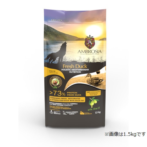 ●ダック(23%)、サツマイモ、ドライダック(16%)、エンドウ豆、ダックの脂肪(8%)、加水分解されたダックタンパク(3%)、ドライルツェルン、ビートパルプ、ドライチコリ(イヌリンとフルクトオリゴ糖の供給源として;1%)、オリーブオイル(0.5%)、亜麻仁、塩化コリン、マンナンオリゴ糖(0.15%)、タウリン、ドライアップル、ドライトマト、フェヌグリーク、ドライ梨、ドライオレンジ、オレガノ、タイム、プロバイオティクス(エンテロコッカス・フェシウム)、ビタミンE(一部保存料として)、ビタミンC、亜鉛、鉄、マンガン、ビタミン B12、ビオチン、ナイアシン、パントテン酸、ビタミンA、ビタミンB2、銅、ビタミンB1、ビタミンB6、ヨウ素、葉酸、セレン、ビタミンD3