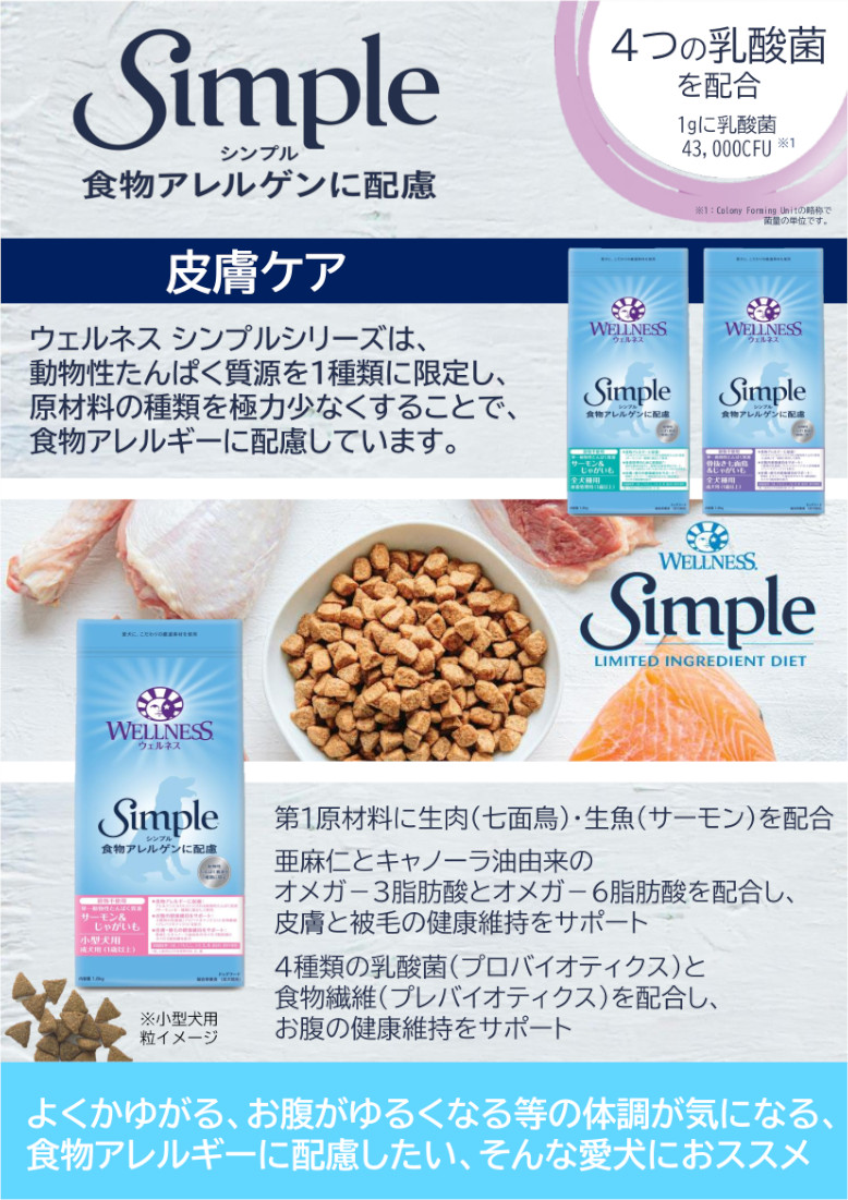 《ウェルネスシンプルシリーズは、動物性たんぱく質源を1種類に限定し、原材料の種類を極力少なくすることで、食物アレルギーに配慮した製品です》