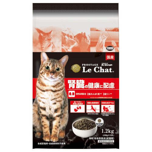 ●腎臓の健康維持に活性炭を配合したんぱく質とリンの含有量を調整。また抗酸化成分とDHA・EPAまた、高齢期の関節の健康維持に配慮しグルコサミンを配合しています。
