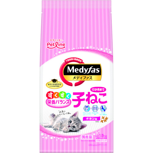●原材料:穀類(とうもろこし、コーングルテンミール)、肉類(ミートミール、チキンミール、チキンレバーパウダー)、豆類(おから)、油脂類(動物性油脂、ガンマ−リノレン酸)、魚介類(フィッシュミール:DHA・EPA源)、糖類(フラクトオリゴ糖)、卵類(ヨード卵粉末)、シャンピニオンエキス、ビタミン類(A、D3、E、K3、B1、B2、パントテン酸、ナイアシン、B6、葉酸、ビオチン、B12)