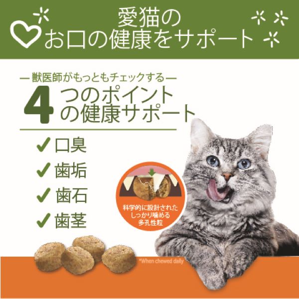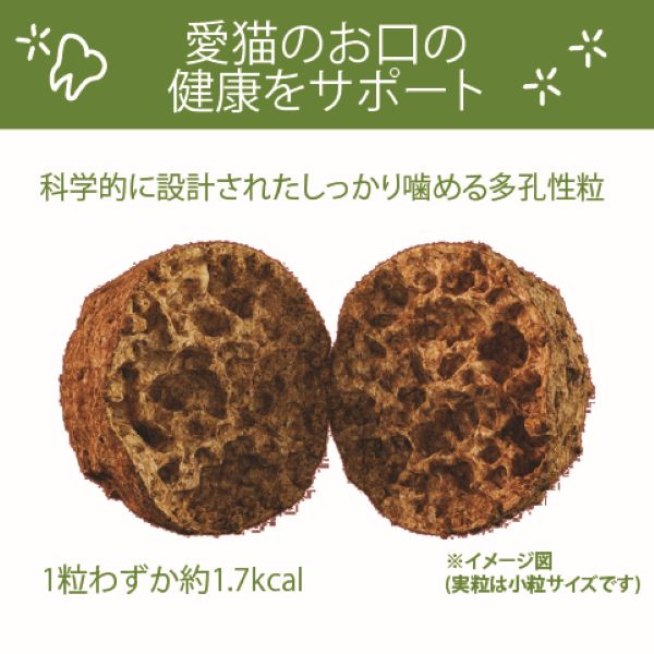 ●科学的に設計されたしっかり噛める多孔性粒を噛むことで、歯垢や歯石の蓄積を抑え、お口の臭いスッキリ。