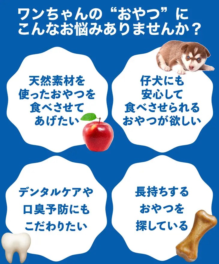 ●愛犬が大好きなラクトースフリーのミルクプロテインを主原料に、アレルギーの不安が少ないフルーツ、ミネラル、天然香料(酵母由来)を使用。お利口にできたときのご褒美として、どうぞ。