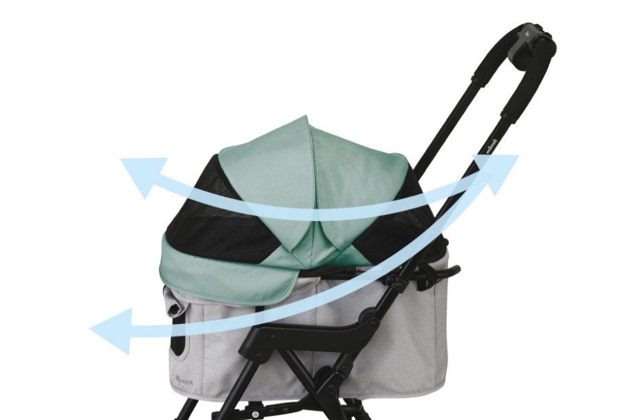 ●幌はファスナーで開閉可能。外に出したくないときはしっかり閉じることができます。幌を開くとペットが前を向きながら走行できます。幌前後とキャリー前方の合計3カ所のメッシュ窓が風を通し、通気性抜群。ペットが快適に過ごせます。キャリー前方のメッシュ窓は、メッシュカバーで閉じることもできます。