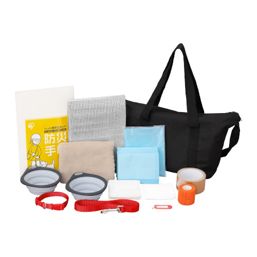 ショルダーバッグ、ディッシュ×2、アルミシート、おそうじシート(10枚入り)、折りたたみトイレ、ペットシーツ、防臭袋(20枚入り)、迷子札、首輪、リード、自着性テープ、タオル、ハンカチ(ガーゼ素材)、テープ、防災手帳