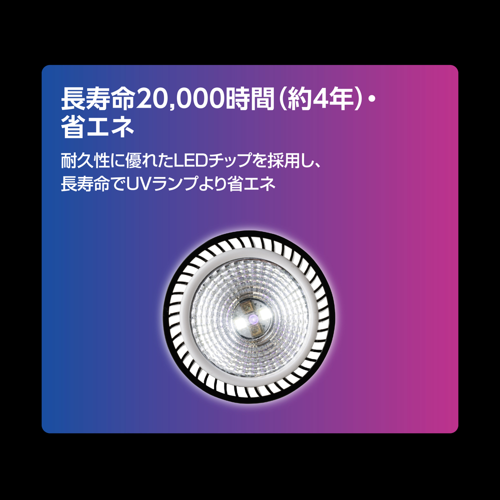 ●長寿命20,000時間(約4年) ピンポイントに紫外線を照射できる集光タイプ。