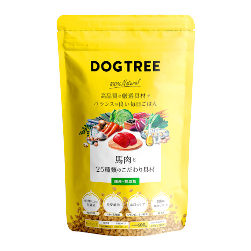馬肉、玄米粉、米粉、野菜類(じゃがいも・さつま芋・ごぼう・きゃべつ・人参・小松菜)、大豆、おから、米ぬか、有機黒糖、鰯粉、豚レバー、卵殻カルシウム、りんご皮、モリンガ、亜麻仁油粉末、黒豆、干し椎茸、米麹、昆布、緑イ貝、ABM乳酸菌、シャンピニオン粉末