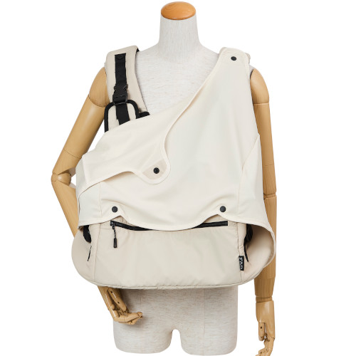 幅広のショルダーベルトとウエストベルトで、肩や腰への負担を軽減する前抱き専用キャリーバッグ