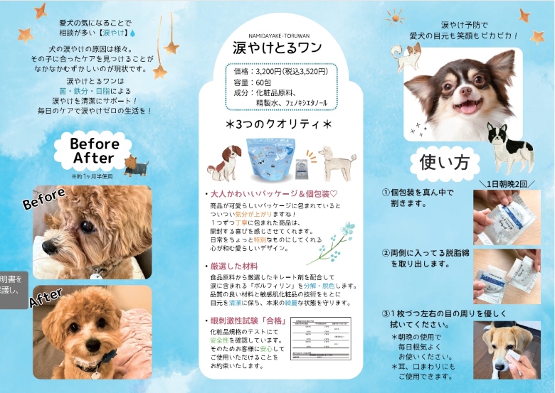 ・安全性は確認していますが、できるだけ愛犬の目に入らないようご使用ください。