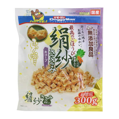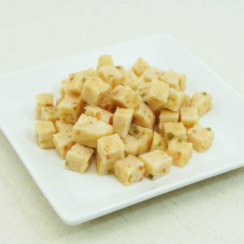 ●原材料(成分):肉類(鶏ササミ、鶏胸肉、鶏肉)、小麦粉、糖類、タピオカでん粉、植物油脂、野菜類(ほうれん草、にんじん)、コラーゲンペプチド、魚軟骨抽出物(コンドロイチン含有)、グリセリン、トレハロース、ソルビトール、膨張剤、ミネラル類(ナトリウム)、ポリリン酸ナトリウム、着色料(クチナシ、マリーゴールド、クロレラ)、グルコサミン