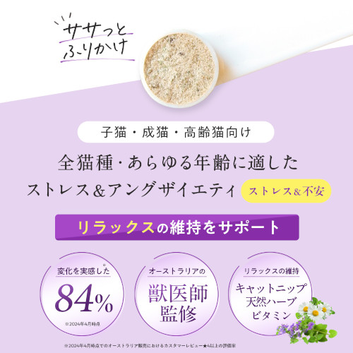 ●ペット愛護先進国オーストラリアで90%の高評価を取得した、全猫種、子猫〜高齢猫まで安心して使える獣医師監修のサプリメント。