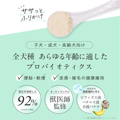 ●スプーン1さじに善玉菌を22億個配合し、腸内細菌のバランスを整えて愛犬の健康を維持します。善玉菌のエサとなるプレバイオティクス(食物繊維)を同時配合し、善玉菌がしっかり増える設計です。
