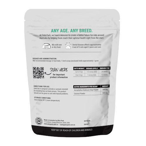 ●アミノ酸が豊富な海藻や口腔の健康維持作用のあるココナッツパウダーなどの成分を摂取することで愛猫の健康を維持し、歯や歯茎、口内の健康維持に役立ちます。